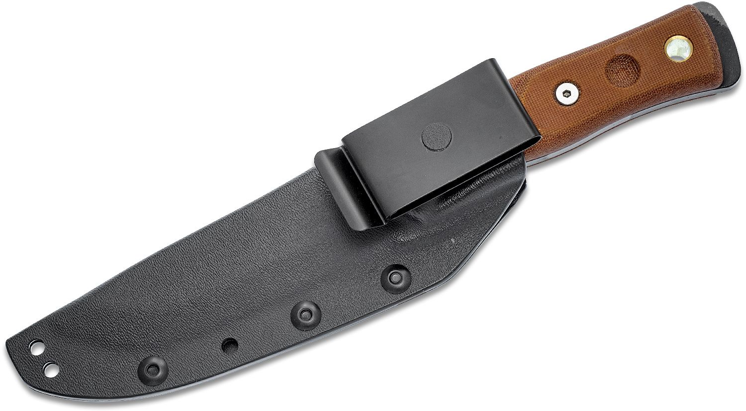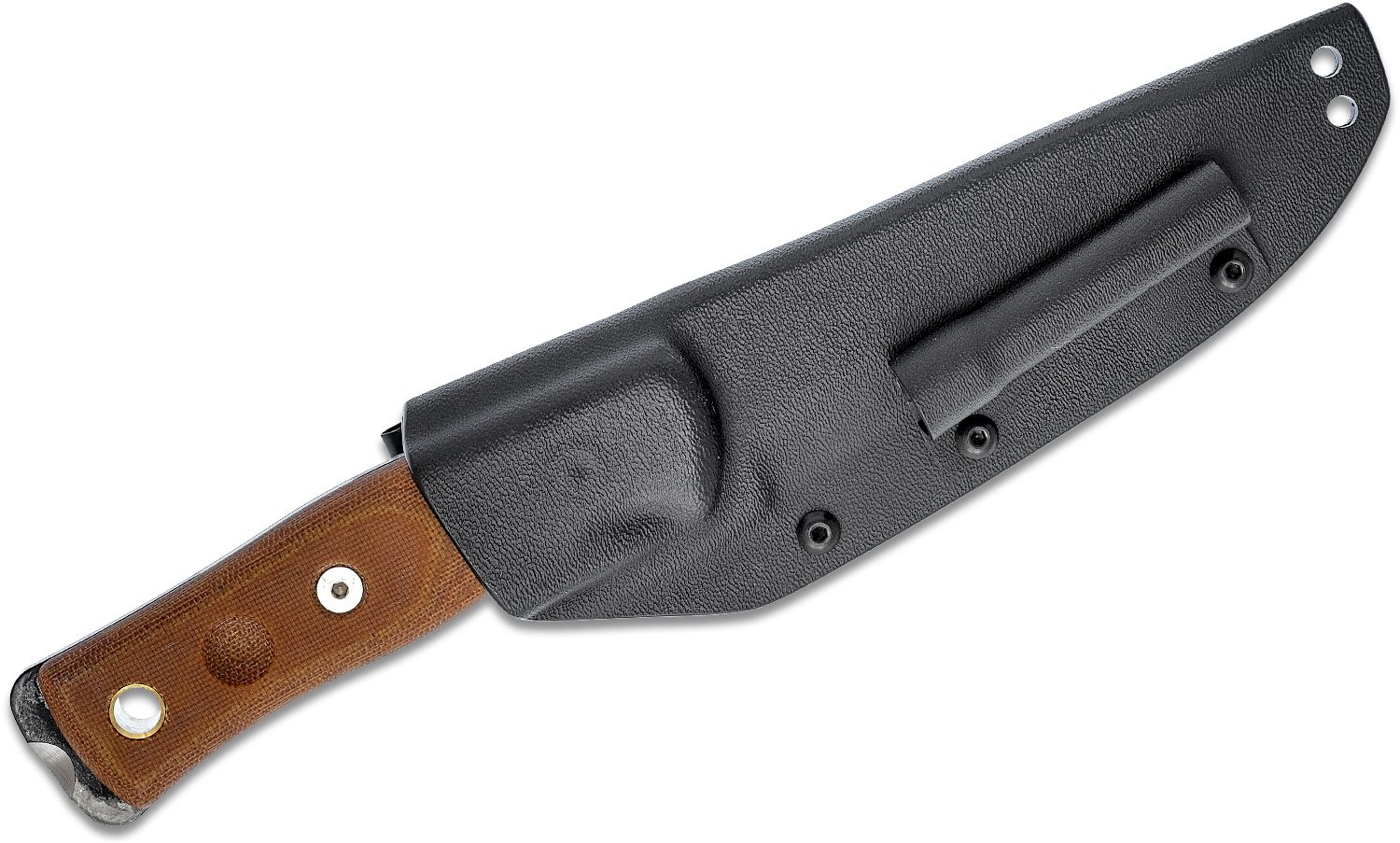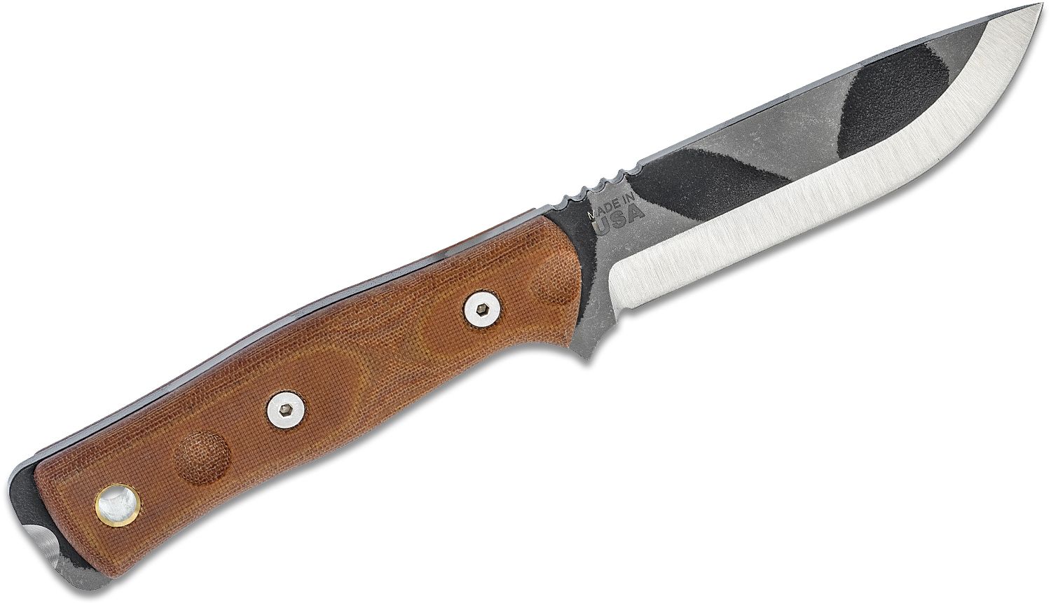 BOB Fieldcraft Knife, 1095 Camo Coated Drop Point, Griffe aus braunem Micarta, schwarze Kydex-Scheide