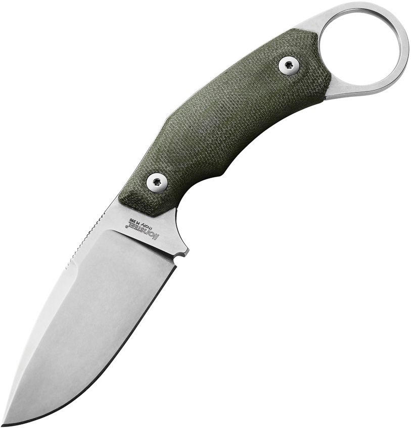 H2, M390 Stonewashed Drop Point-Klinge, grüner Canvas-Micarta-Griff, schwarze Lederscheide